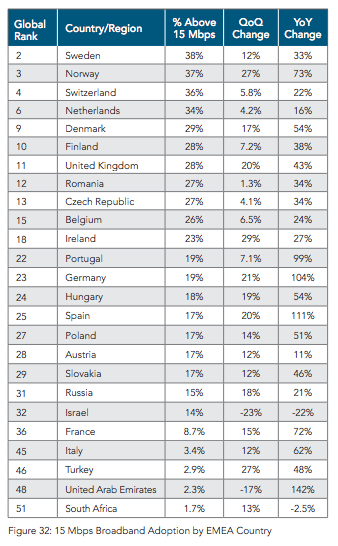 Los primeros puestos a nivel mundial son para Corea del Sur con una velocidad media de 20,5 Mb, Suecia con 17,4 Mb, Noruega con 16,4 Mb, Suiza con 16,2 Mb y Hong Kong con 15,8 Mb de media.