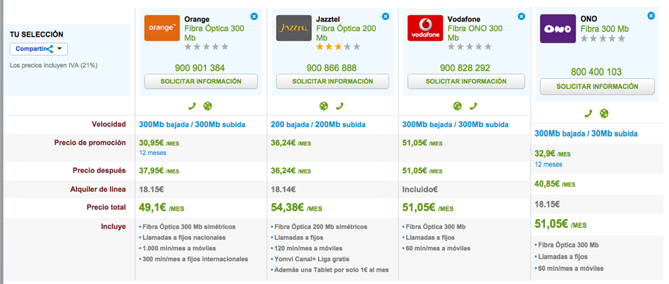 1. Su precio atractivo siendo los 50 Mb y los 300 Mb simétricos de Fibra los más baratos en España